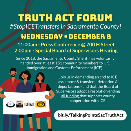 What: Press conference on Sacramento County’s relationship with ICE. Advocates will call for the Sheriff’s Department to stop its voluntary assistance to ICE and for the Board of Supervisors to adopt a resolution to end all funding that supports the county’s cooperation with, and referral of immigrants, to ICE.